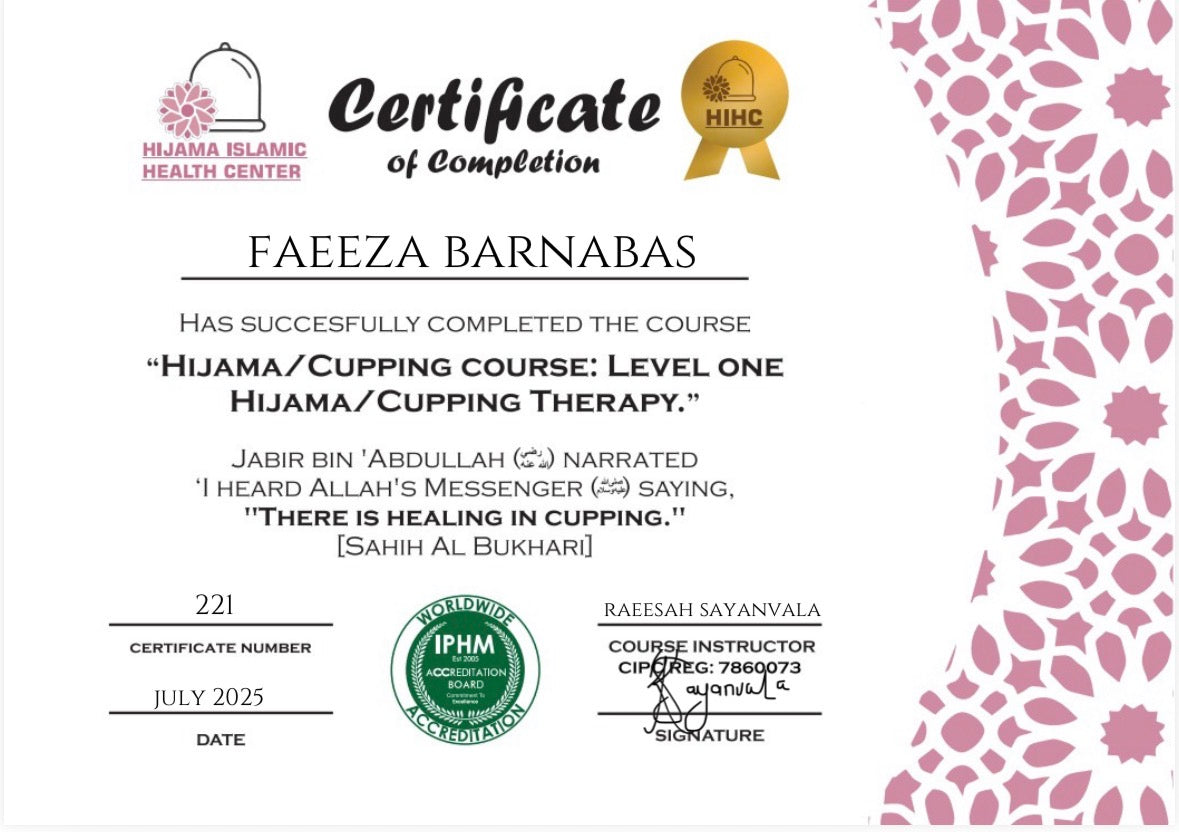 Level 1 - was completed with HIHC who is an internationally recognised Educator in Hijama and is registered with IPHM