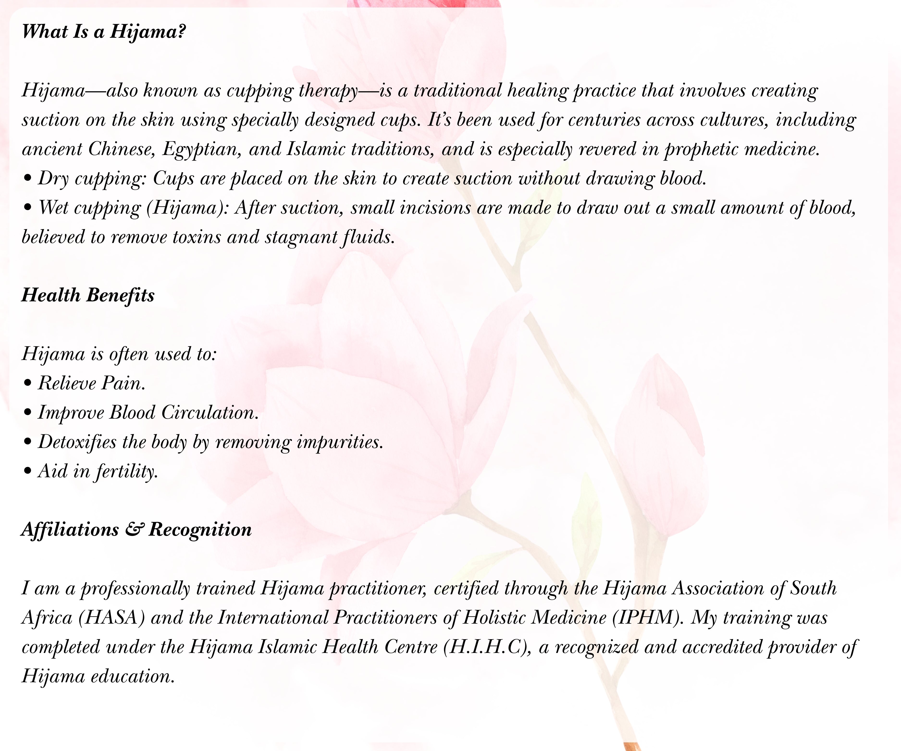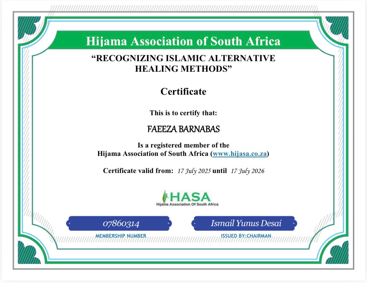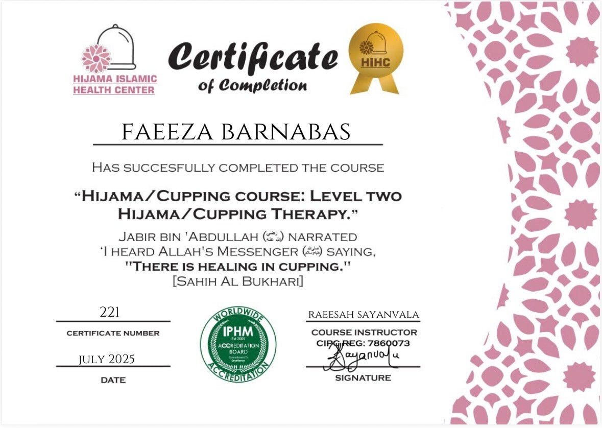Level 1 - was completed with HIHC who is an internationally recognised Educator in Hijama and is registered with IPHM